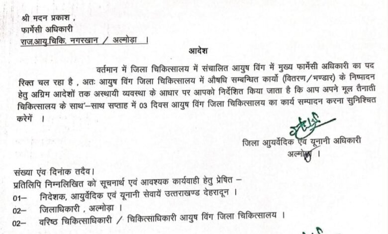 अल्मोड़ा। वर्षों से बिना फार्मेसी अधिकारी के संचालित हो रहे राजकीय आयुर्वेदिक चिकित्सालय अल्मोड़ा में अंततः अस्थायी फार्मेसी अधिकारी की नियुक्ति के आदेश जिला आयुर्वेदिक एवं यूनानी अधिकारी द्वारा जारी कर दिए गए हैं।