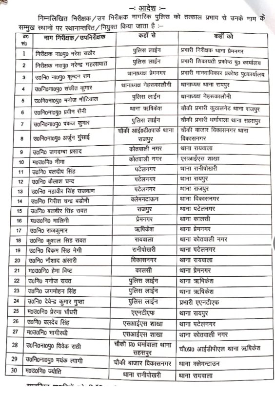 दून पुलिस में बड़ा फेरबदल, तीन थानाध्यक्ष समेत 30 पुलिस अधिकारियों के तबादले, देखें पूरी सूची